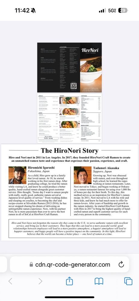 Introducing the menu at HiroNori Craft Ramen - Irvine, a popular ramen spot in Irvine, CA. This Asian-owned restaurant offers a variety of ramen options including tonkotsu, vegan, and spicy miso. Customers rave about the flavorful broth and perfectly cooked noodles, with standout dishes like the crispy karaage and pork bun sandwiches. The chic interior and attentive service add to the overall dining experience. While some customers mention the upfront service charge as a drawback, the quality of the food remains a highlight. With options for pescatarians, vegetarians, and vegans, HiroNori Craft Ramen caters to a diverse range of dietary preferences. Whether you're looking for a cozy lunch spot or a trendy dinner destination, HiroNori Craft Ramen is a must-visit for delicious ramen and appetizers.